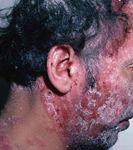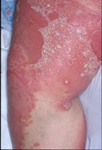 ผิวหนังอักเสบเป็นปื้นแดงหนาขอบเขตชัดเจน มีสะเก็ดเงินปกคลุม ลอกเป็นขุย เป็นๆหายๆ มักเป็นบริเวณข้อศอก ข้อเข่า ผื่นอาจมีขนาดเล็กหรือใหญ่กระจายทั่วร่างกาย หรือเป็นที่ศีรษะจะเป็นขุยขาว