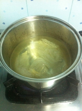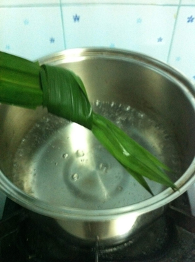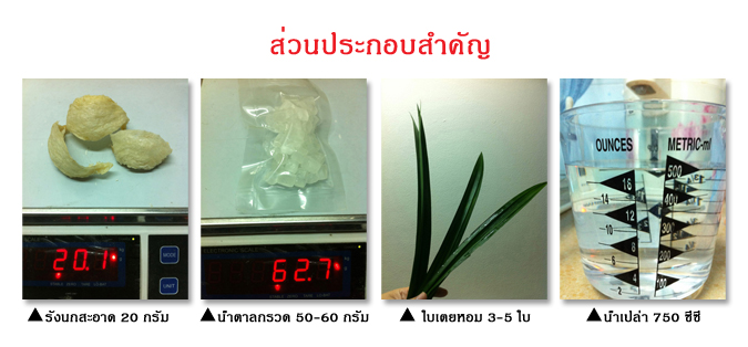 5. พร้อมเปิดฝาแล้ว เราก็นำใบเตยออกจากหม้อจากนั้นก็ใส่เนื้อรังนกที่พองเต็มที่แล้วลงไปต้ม