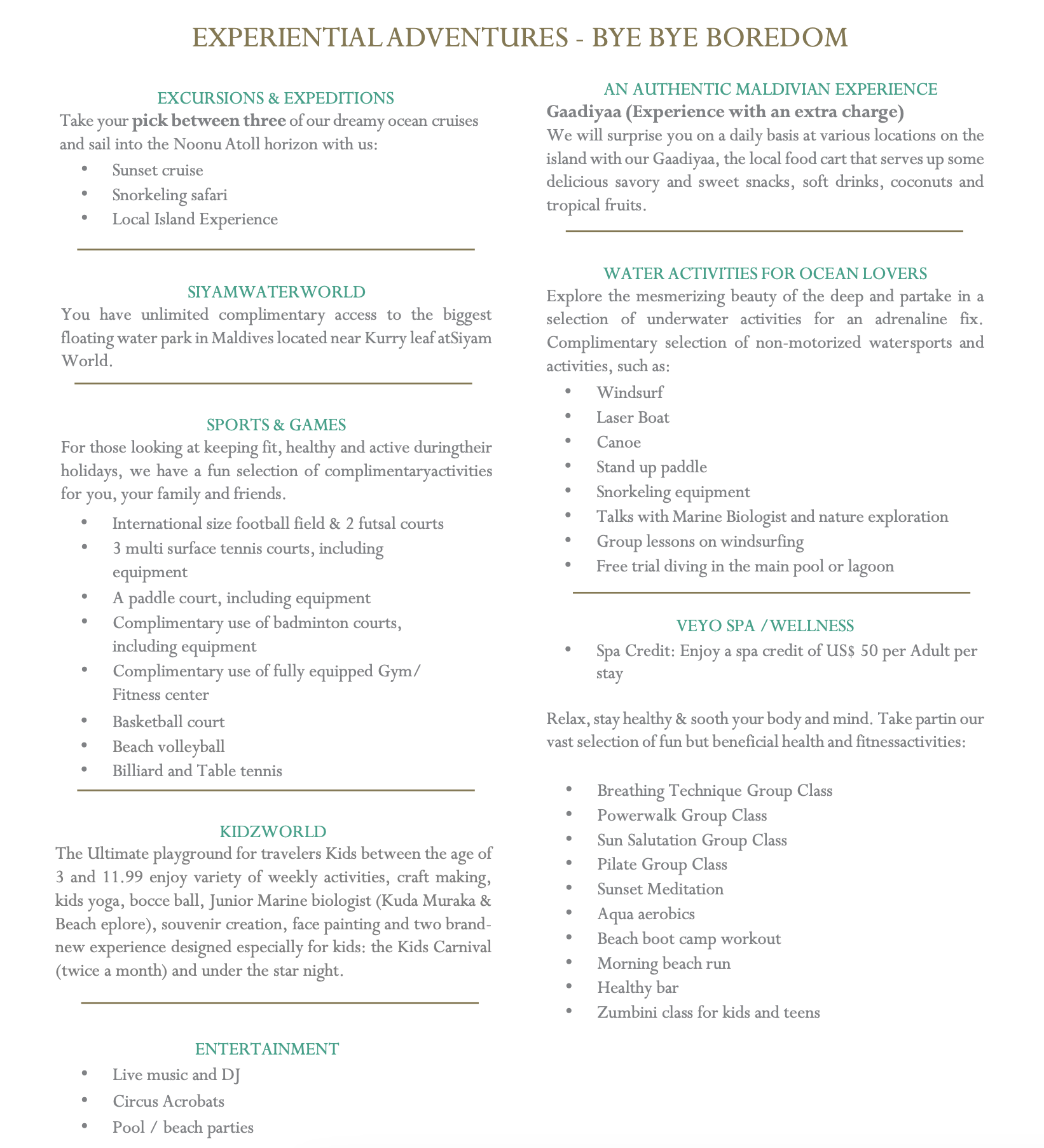 - ราคาข้างต้นคำนวณจากราคาและอัตราภาษีของประเทศมัลดีฟส์ณ อัตราปัจจุบัน และภาษีอื่นๆซึ่งอาจจะมีการผันแปรหรือเปลี่ยนแปลงตามการเปลี่ยนแปลงของรีสอร์ทได้