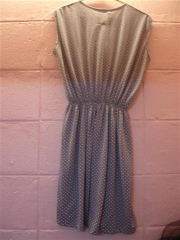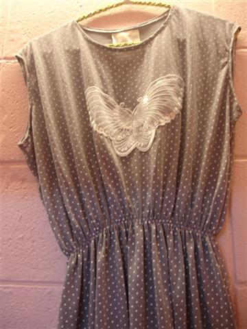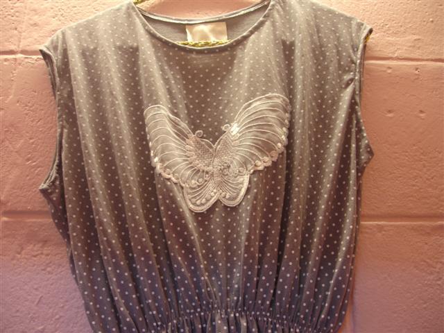 Dress ผ้ายืดจั๊มเอว สีเทาจุดขาว บริเวณหน้าอกตกแต่งด้วยผ้าลูกไม้ลายผีเสื้อ ใส่แล้วน่ารักค่ะ เวลาใส่เอาเข็มขัดคาดที่เอวหน่อยจะทำให้ดูมี detail มากขึ้นค่ะ