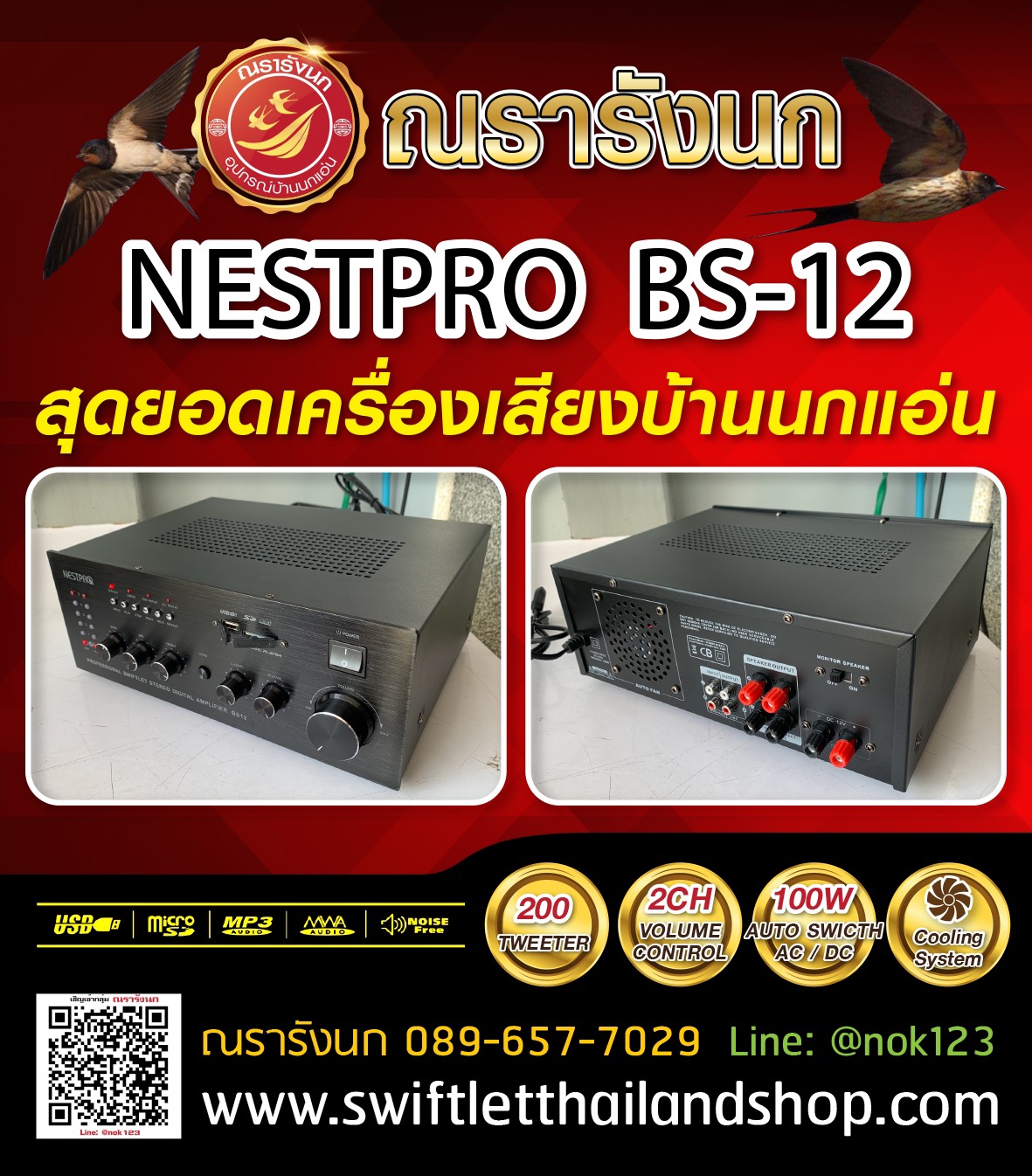 อีเมลล์: swiftletthailandshop@gmail.comB8H-Nestpro Amplifier MXBS12-2ch เครื่องเสียงรุ่นเล็กคุณภาพสูง จาก NESTPRO รองรับ USB และ SD Card กำลังขับลำโพง TWEETER 200 ตัว แยกอิสระ 2 Channel ปรับเสียงแยกได้อิสระแต่ละ Channel มีพัดลมระบายอากาศระบายความร้อนในตัว
