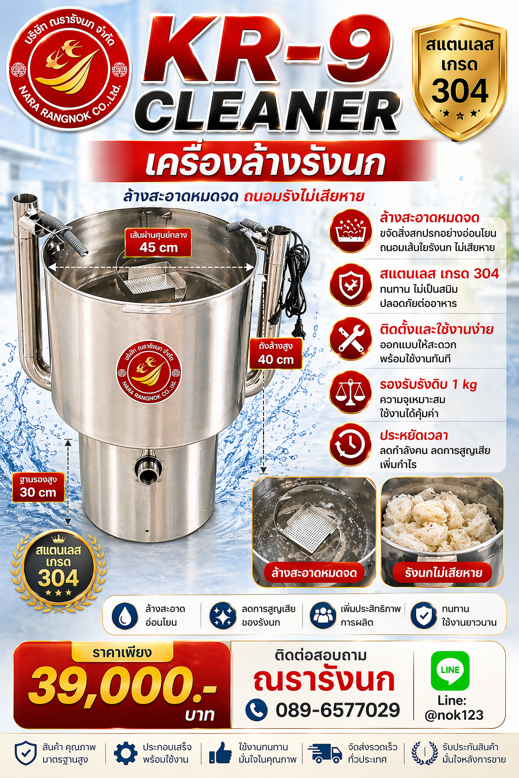 เครื่องล้างรังนก K-9 CLEANER ถังล้างเส้นผ่านศูนย์กลาง 45 cm สูง 40 cm ฐานรองสูง 30 cm ทำจากสแตนเลส เกรด 304 ติดตั้งและใช้งานง่าย รองรับรังดิบ 1kg ประหยัดเวลา ลดกำลังคน ลดการสูญเสีย ติดต่อสอบถาม ณรารังนก 089-6577029 Line: @nok123