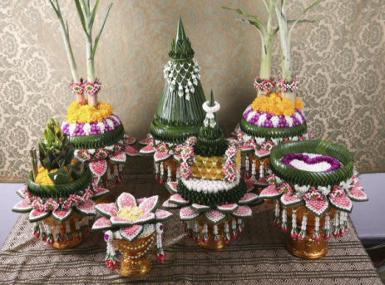 ทุกพานตกแต่งด้วยดอกไม้สด ใบตองและร้อยตาข่ายอย่างประณีตทุกพาน พานขันหมากและพานสินสอดมีผ้าโปร่งสีทองหุ้มพาน แถมข้าวตอกดอกไม้สำหรับโรยสินสอดทุกแพ็คเกจ