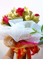 ช่อเฟอเรโร่ เฟอเรโร่ จำนวน 20 ลูก +ดอกกุหลาบแดงจำนวน 12 ดอก ห่อช่อโทนสีขาว ทอง น้ำตาล ผูกโบว์แดงน้ำตาลอย่างสวยงาม