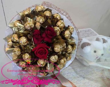 ช่อเฟอเรโร่ จำนวน 15 ลูก+ตุ๊กตา ตัวเล็กใส่เสื้อสีแดง จำนวน 5 ตั้ว