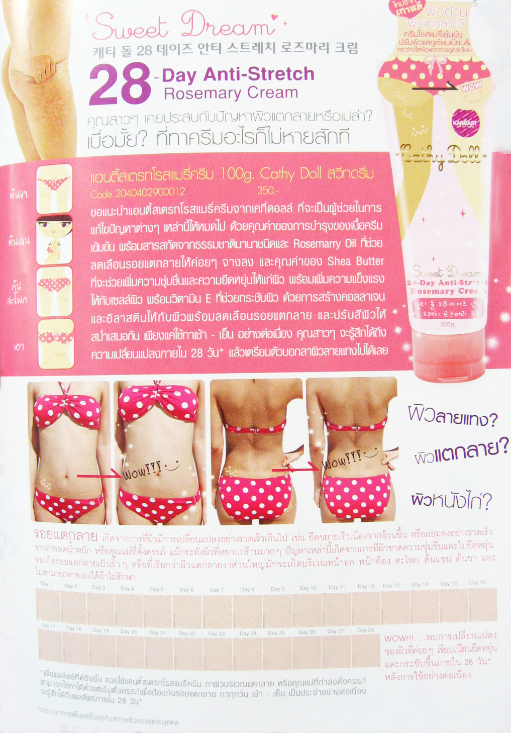 ปัดความกังวลของผิวลายแทงให้หมดไปด้วยเคที่ ดอลล์ แอนตี้สเตรทโรสแมรี่ครีม ที่อุดมไปด้วยสารสกัดน้ำมันจากธรรมชาติ (Natural Oil) เช่น Jojoba Oil, Common Camellia Oil,Grape Seed Oil, Olive Oil, Almond Oil และ Rosemary Oil ที่ช่วยลดเลือนรอยแตกลายให้จางลงและคุณค่าของ Shea Butter ที่ช่วยเพิ่มความชุ่มชื่นและเพิ่มความยืดหยุ่นให้แก่ผิว และยังมีสารที่มีประสิทธิภาพในการเพิ่มความชุ่มชื่นให้มากยิ่งขึ้น เช่น Coenzyme Q10, Vitamin-E,Hyaluron Acid, Betine,Collagen, Lipidure-PMB จึงช่วยปรับความสมดุลของน้ำหล่อเลี้ยงและมอบความยืดหยุ่นให้แก่ผิวเพื่อดูแล ผิวที่ขรุขระ และเป็นครีมสำหรับทาแก้ท้องลายโดยเฉพาะ