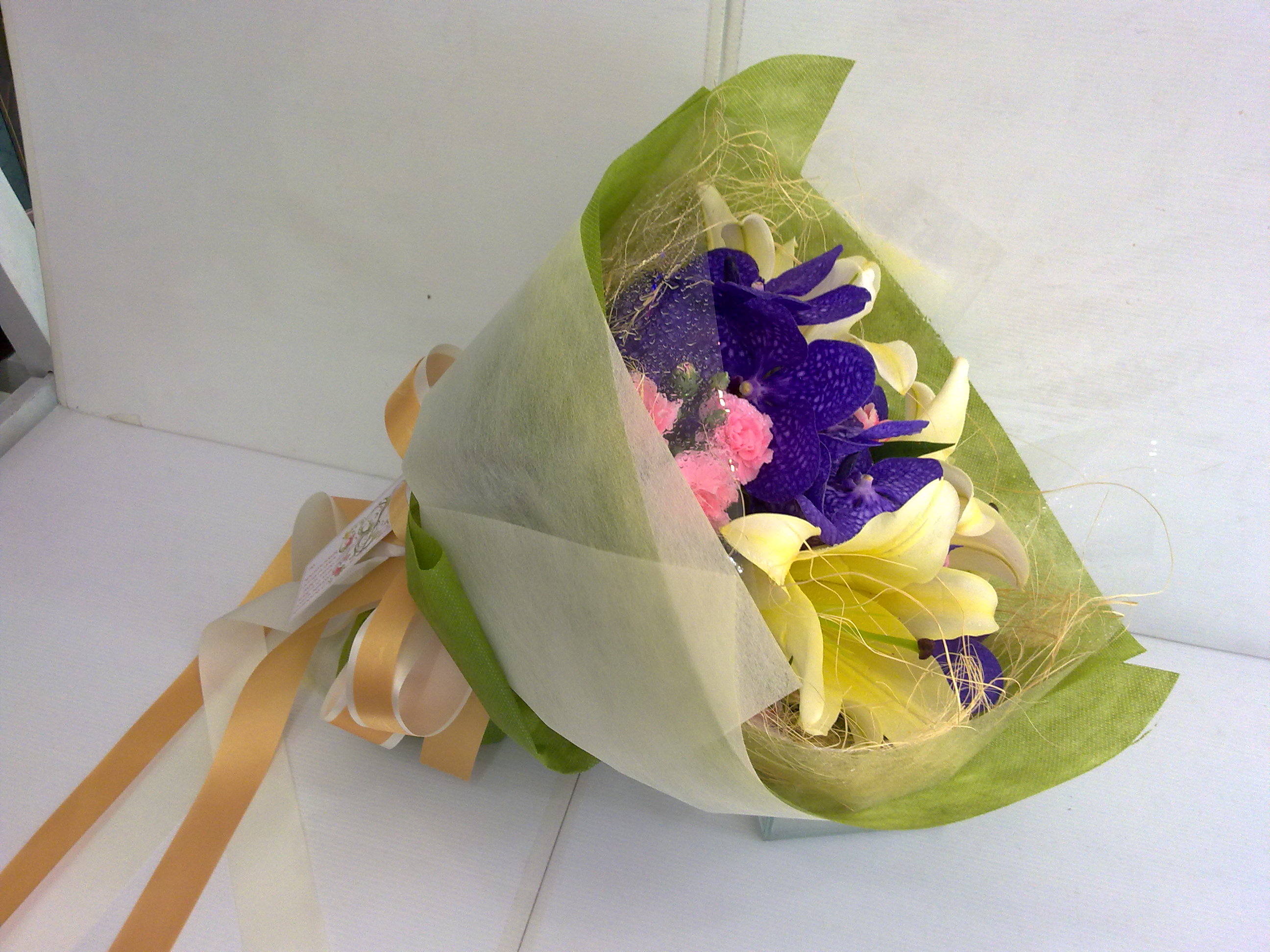 กล้วยไม้แว้นด้าม่วงลิลลี่เหลืองและสเปรย์ชมพูห่อช่อแนวเท่ๆเรียบง่าย