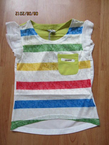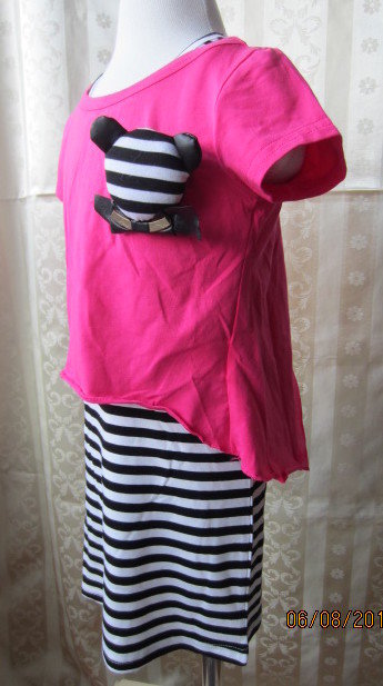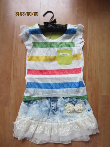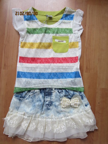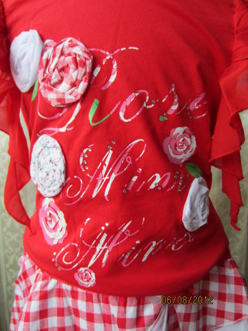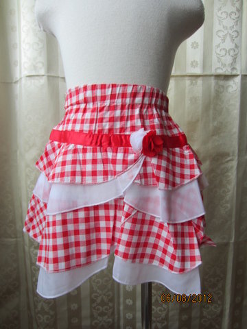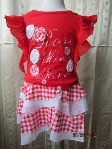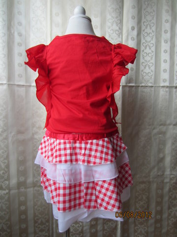 ชุดเสื้อกับกระโปรงสีสดใส ตัวเสื้อเป็นเสื้อยืดคอกลมสีแดง แต่งระบายที่แขนทั้งสองข้าง ด้านหน้าสกรีนลายและแต่งดอกไม้สีขาว ตัวกระโปรงเป็นสีแดงลายสก๊อตสลับกับผ้าชีฟองสีขาวเป็นชั้นๆดูน่ารักสดใส เอวเป็นแบบยางยืด แต่งเข็มขัดและดอกไม้สีแดงที่ตัวกระโปรงจ้า