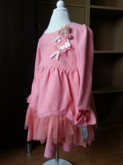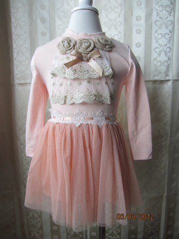 รายละเอียด: ชุดเดรสเจ้าหญิงแสนสวย ตัวเดรสเป็นสีชมพูอ่อน คอกลม แขนยาว แต่งดอกไม้และโบว์สีน้ำตาลที่คอ ด้านหน้าแต่งด้วยผ้าลูกไม้สุดหรู บริเวณเอวด้านหน้าแต่งด้วยเข็มขัดผ้าลูกไม้ ตัวกระโปรงเป็นผ้าตะข่ายสีชมพูดูพองๆ แบบเจ้าหญิงๆ ข้างในมีซับในไม่โป๊แน่นอนจ้า