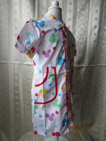 รายละเอียด: ชุดกระโปรงสีขาวลายมิกกี้เมาส์หลากสีสัน แขนเสื้อตุ๊กตาน่ารักสดใส ติดกระดุมด้านหน้าสีแดง กระเป๋าทั้งสองข้างขลิบสีแดง กระเป๋ามีขนาดใหญ่และก้นลึก เก็บของได้เยอะและไม่ต้องกลัวของจะหล่นหายค่ะ