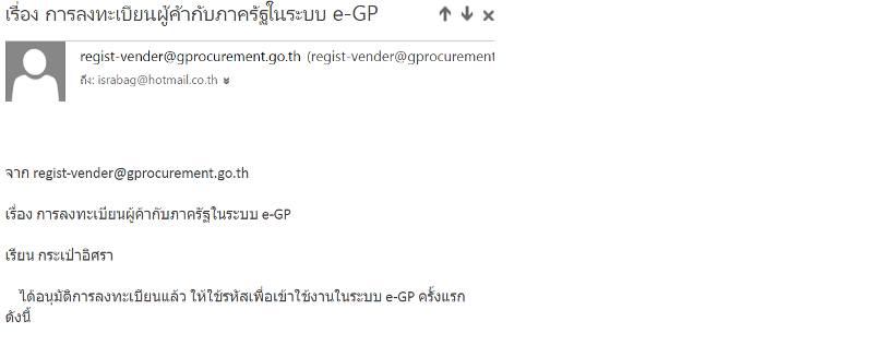 รายละเอียด: ได้รับแจ้งอนุมมัติการลงทะเบียนผู้ค้ากับภาครัฐในระบบ e-GP แล้ว