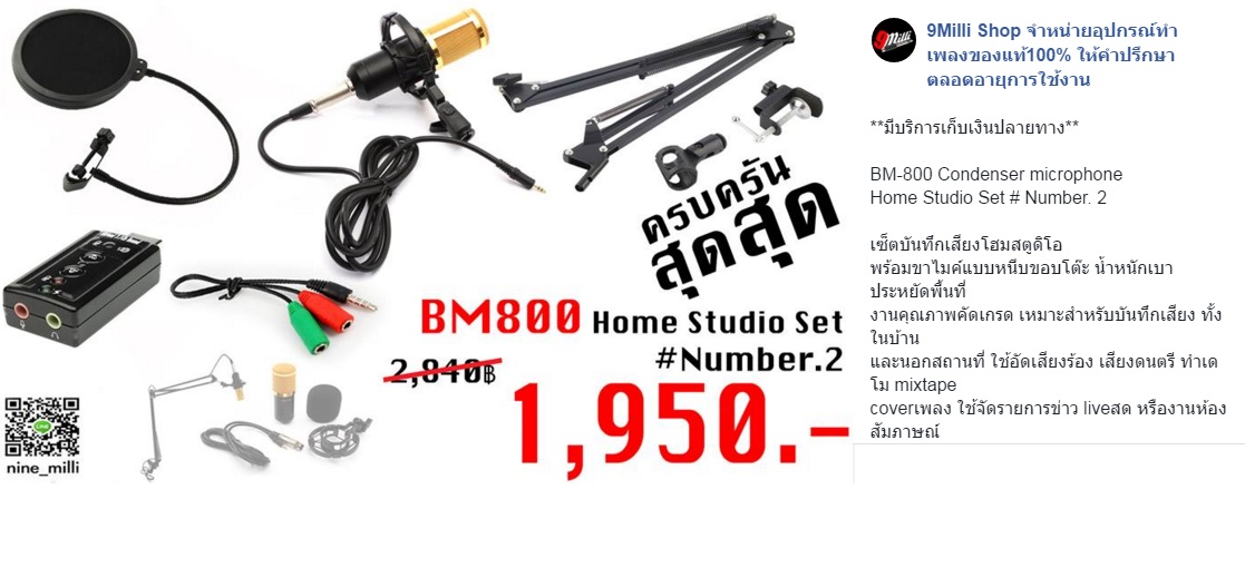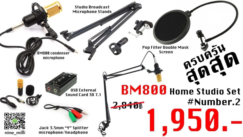 โฮมสตูดิโอพร้อมขาไมค์แบบหนีบโต๊ะ และ Pop Filter ป้องกันเสียงลม ที่เกิดจากการร้องหรือการออกเสียง อีกทั้งเรายังมี Souncard USB สำหรับ Notebook มีปัญหาเรื่องรูเสียบไมค์รูเดียว ช่วยให้ เสียงดียิ่งขึ้น และ แจ็คหัวแปลง 3.5mm Y splitterสำหรับมือถือระบบ Android
